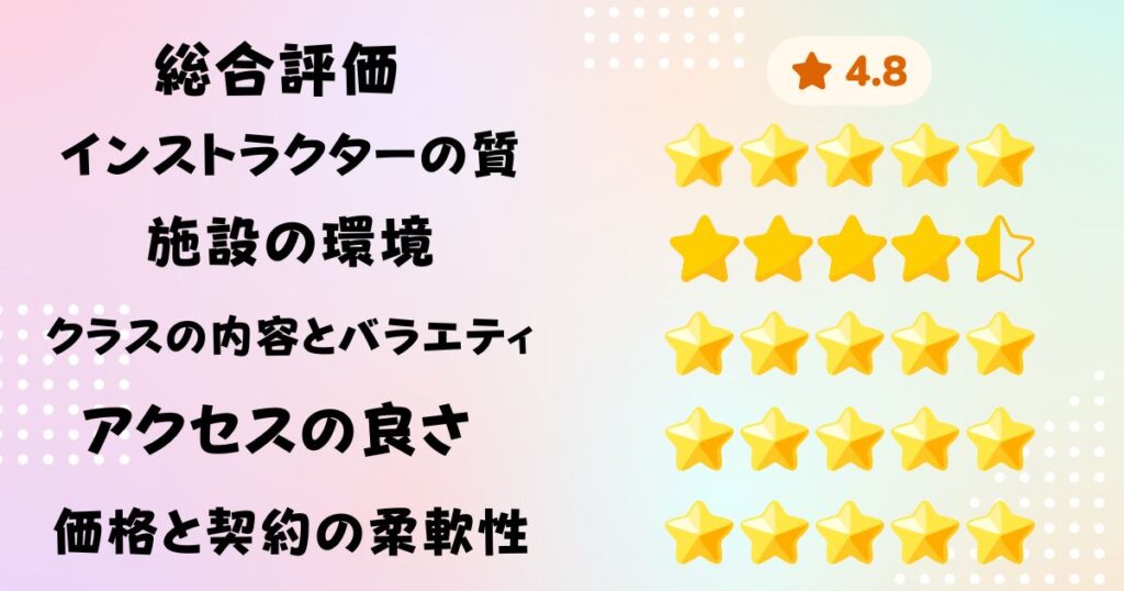 スタジオが2つあり、自分の行きたいレッスンに選べるのでそこが楽しいです