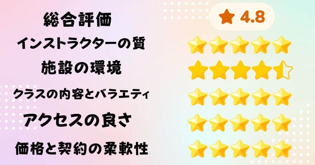 さらに、インストラクターの指導の丁寧さ・明るい雰囲気・清潔な設備など、初心者でも通いやすい環境面への満足度が目立ちます。