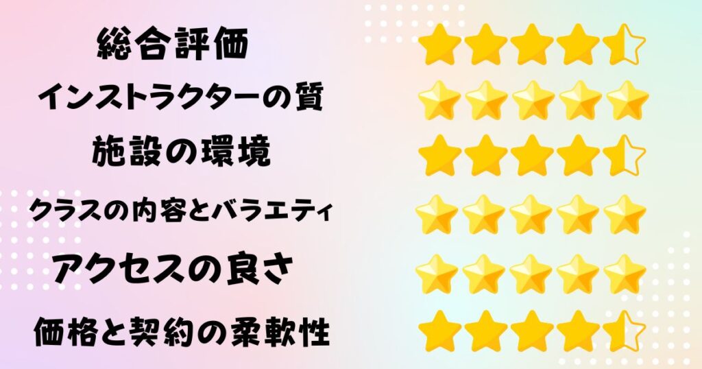 インストラクターのレッスンの質はとても高い分もう少し設備良くならないかなと勿体無く感じる。