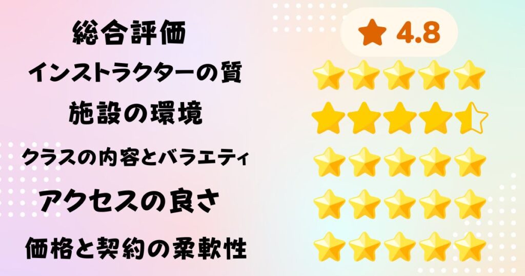 レッスンの種類の豊富さや予約の取りやすさ、長期間無理なく続けられる環境も高く評価されています。