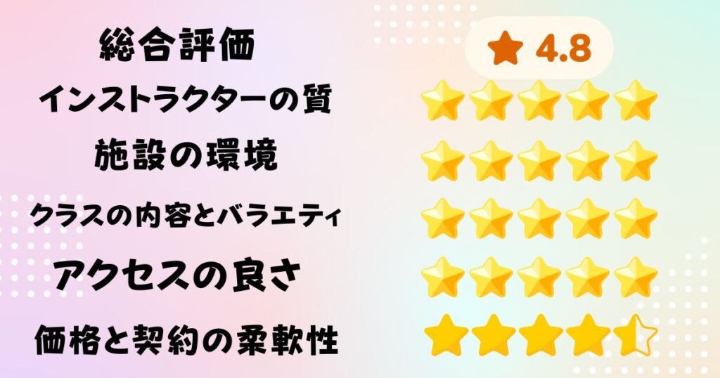 | Ruby (ルビー) | 1,100円 | 2,600円〜15,800円 1回券から | 0円 | 2,200円 →0円 *体験中に 入会の場合 |