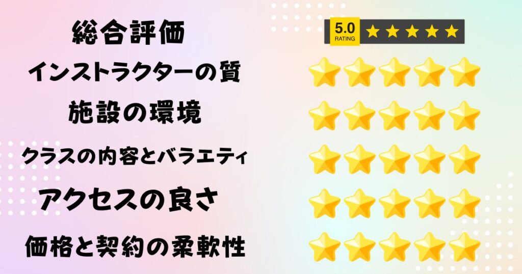 *総合評価はインストラクターの質・施設の環境・クラスの内容とバラエティ・アクセスの良さ・価格と契約の柔軟性の5つの評価項目から1年以内の口コミを参考に算定しています。
